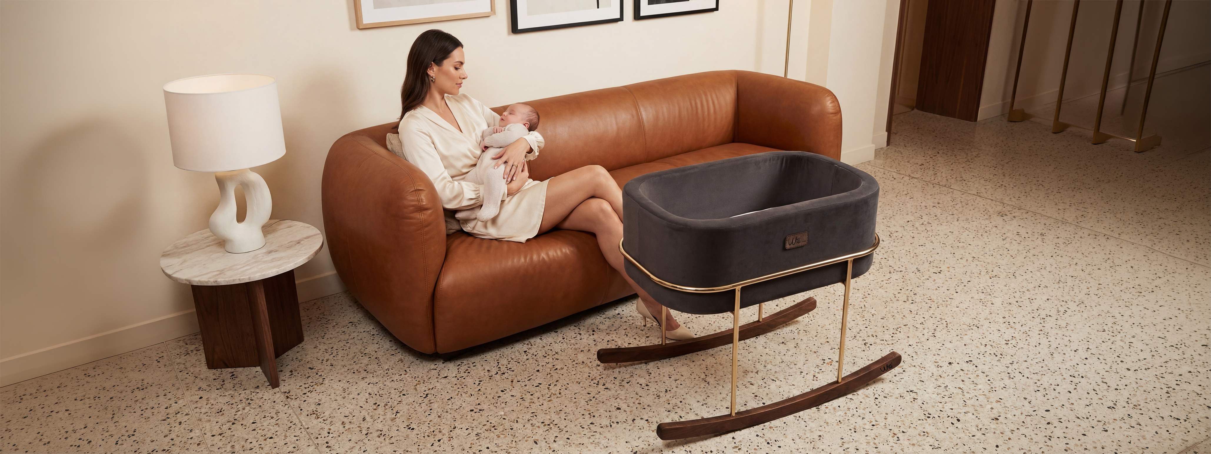 Featuring silky-soft, wipeable fabrics and a sleek chrome-plated frame, the main unit provides a gentle and hygienic space that easily transitions from a co-sleeper to a playpen.